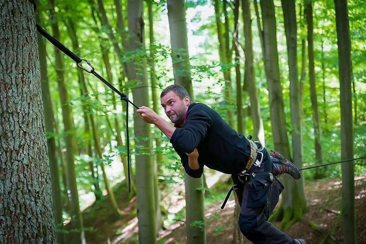 Mann überquert eine selbstgebaute Seilbrücke zwischen Bäumen