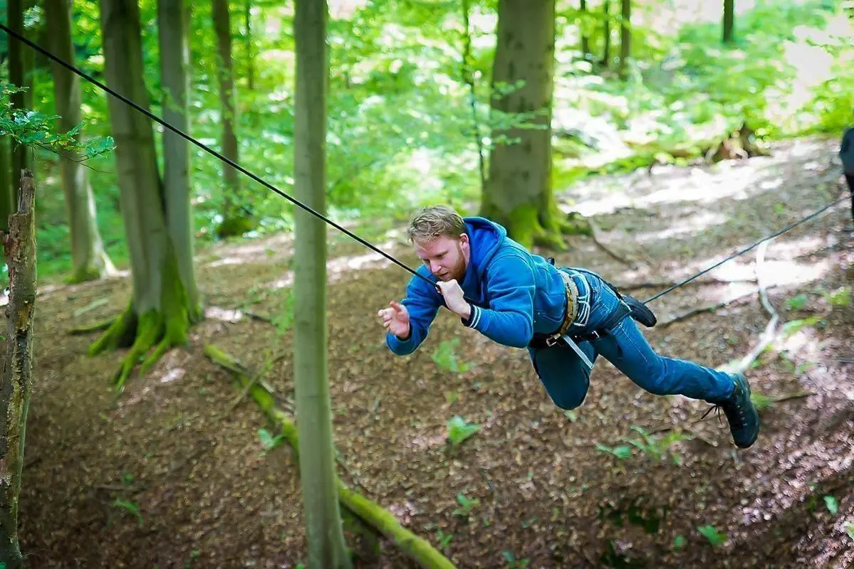 Mann überquert mit Seilquerung einen Waldabschnitt über Laub