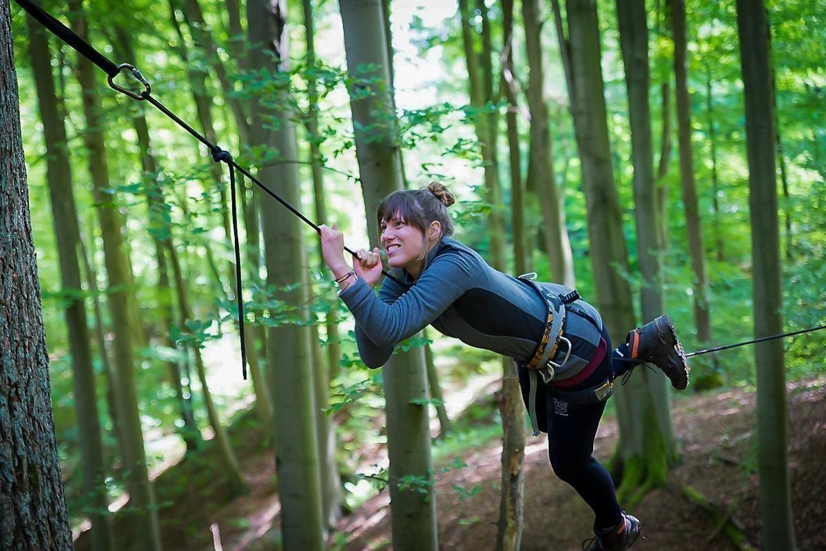 Selbstgebaute Seilquerung wird zwischen Bäumen genutzt