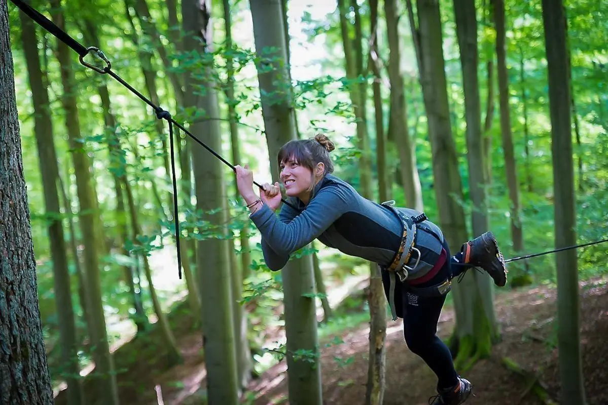 Seilquerung zwischen Bäumen mit Sicherheitsgurt und Karabiner