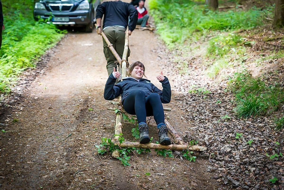 Gruppe arbeitet an einer selbstgebauten Trage im Waldweg zwischen Bäumen