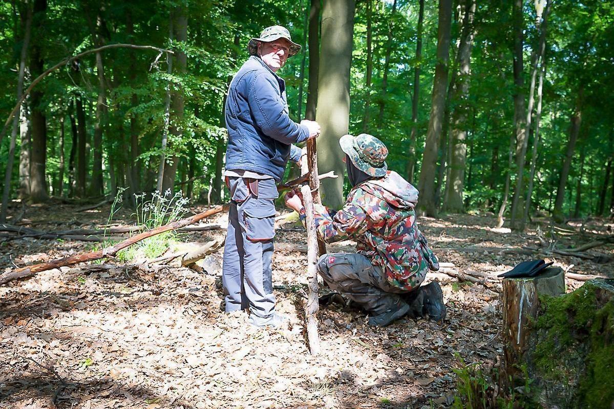 Zwei Personen arbeiten im Wald an einer Holzstruktur mit Stöcken