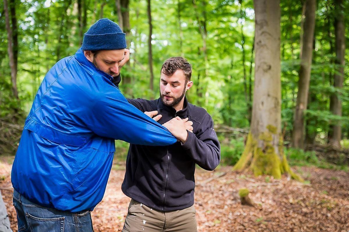 Zwei Männer üben eine Selbstverteidigungstechnik im Wald