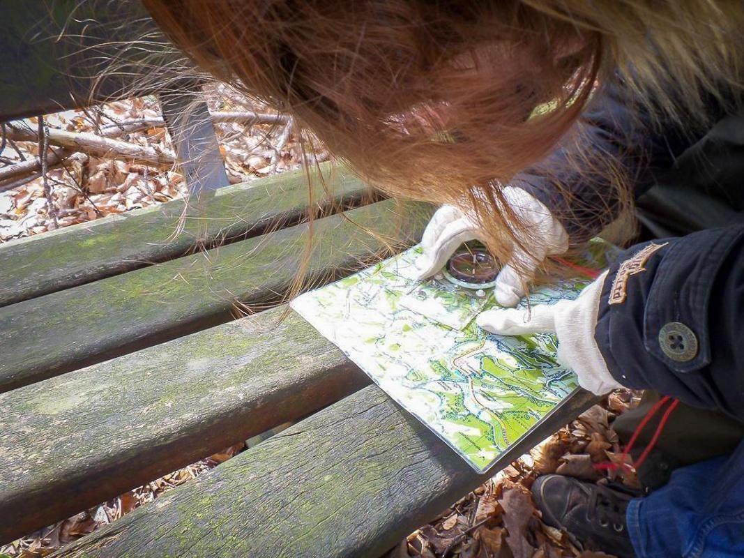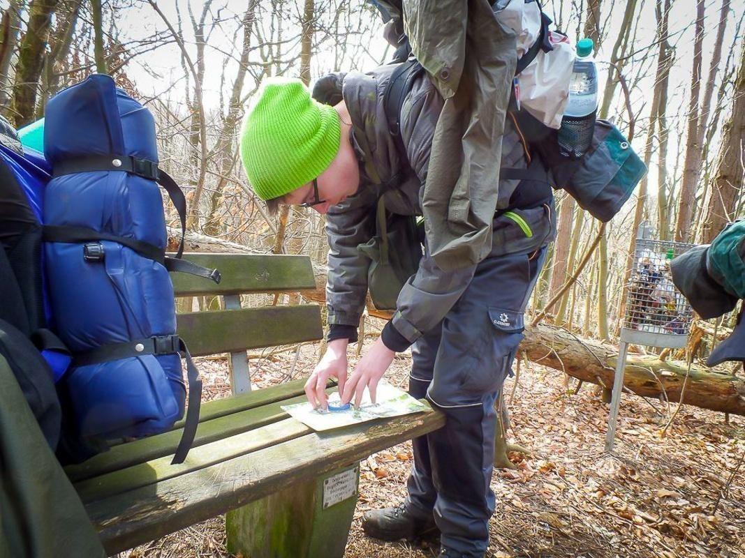 Karte wird auf einer Bank im Wald studiert, Rucksack und Wasserflasche sichtbar