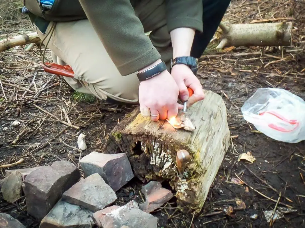 Feuerstahl entzündet Zunder auf einem Holzstück neben Steinen