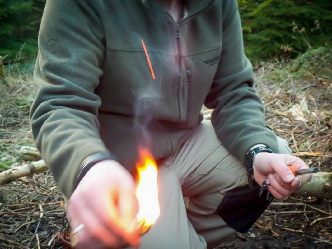 Feuerstahl erzeugt Funken und entzündet Zunder in der Hand