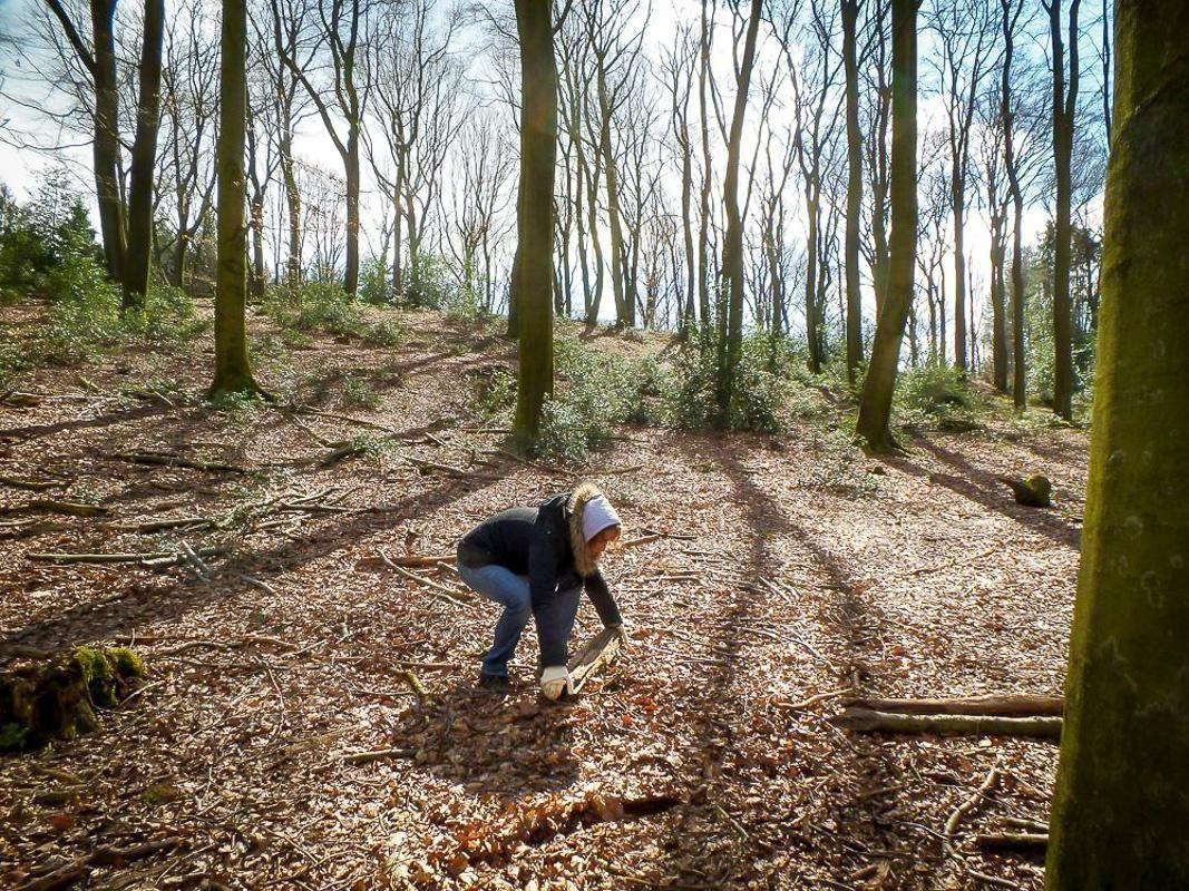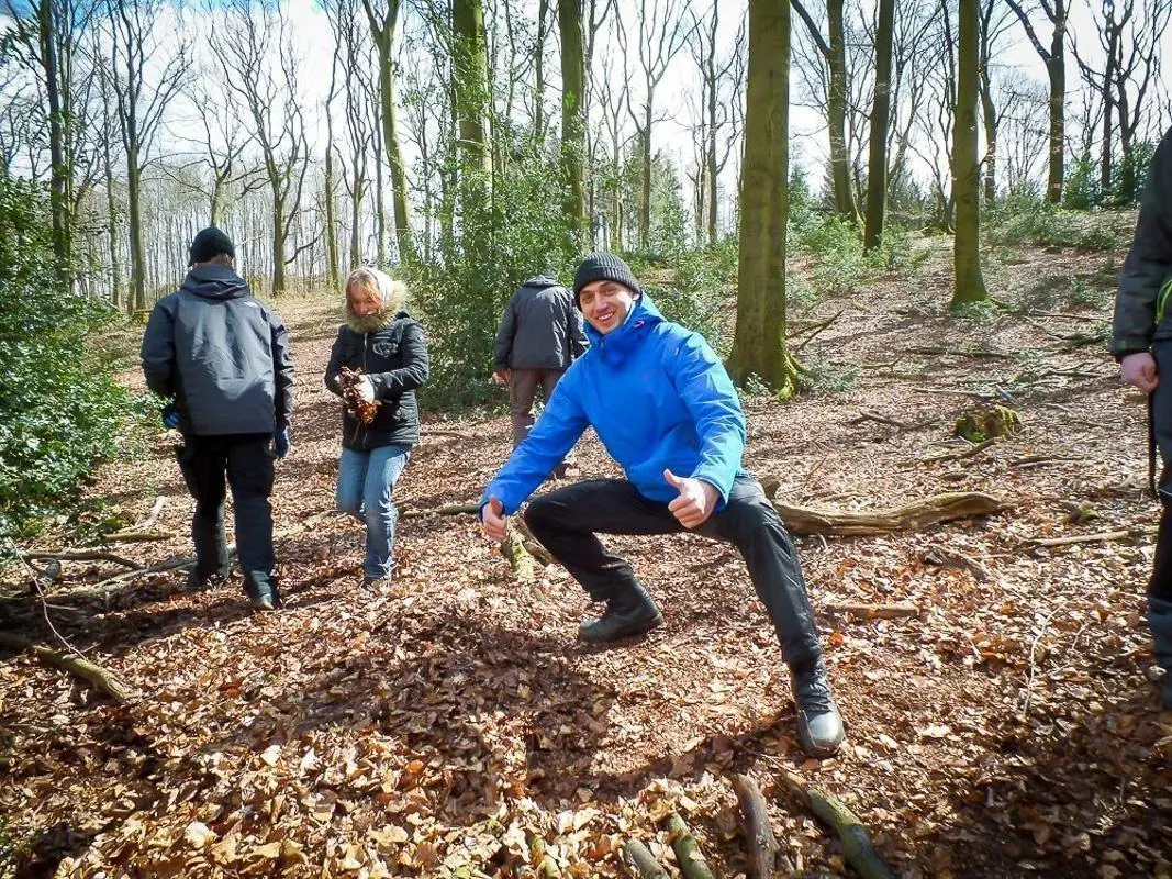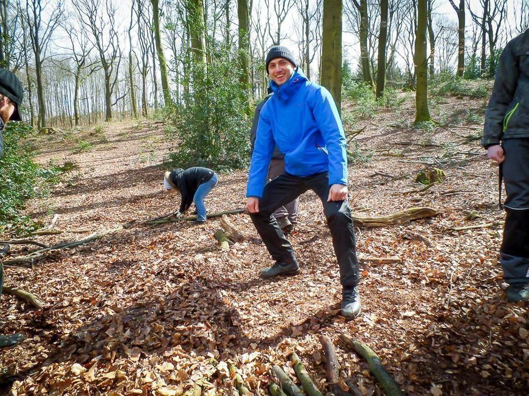 Mann in blauer Jacke steht auf Laub, während andere Holzstücke sammeln