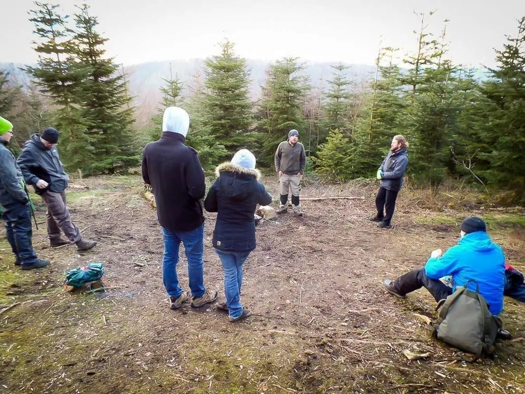 Gruppe steht im Wald und hört einem Vortragenden zu