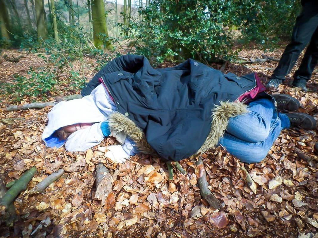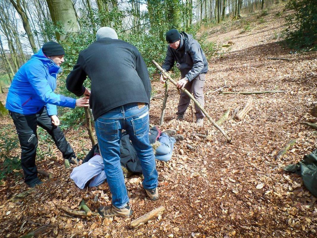 Gruppierung baut improvisierte Trage aus Ästen zur Unterstützung einer liegenden Person