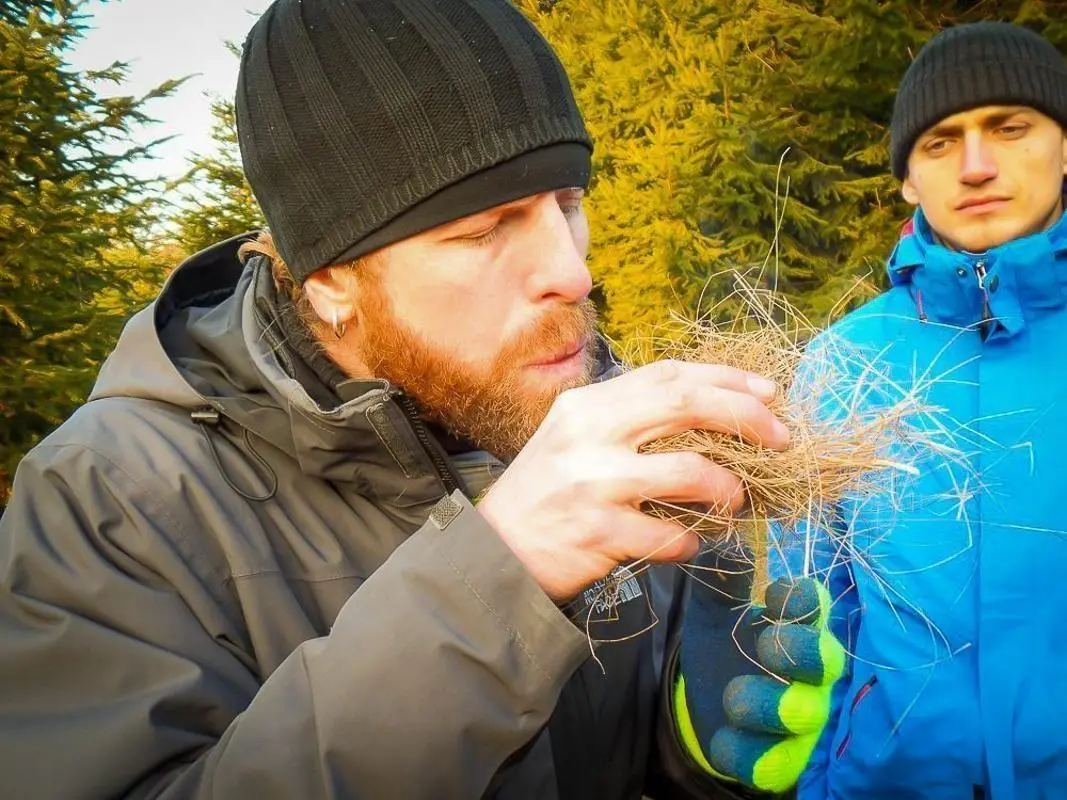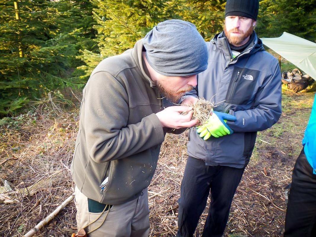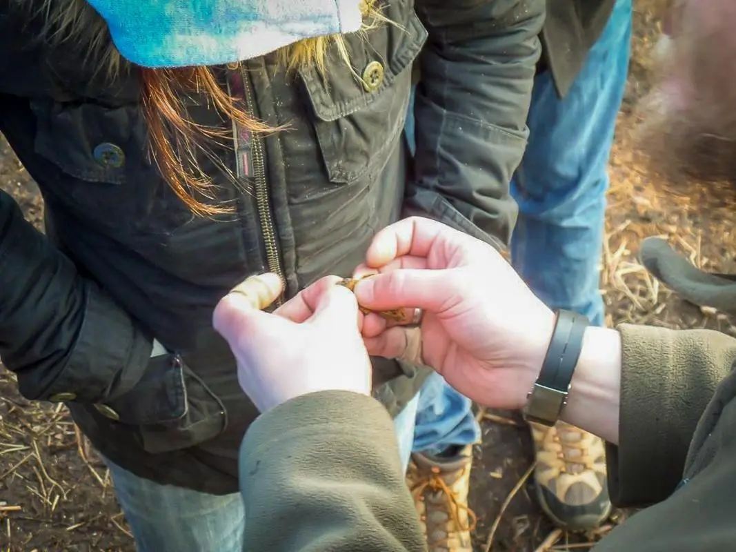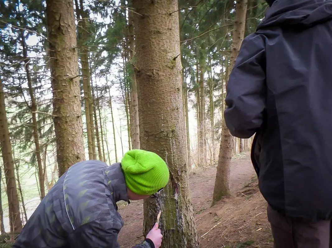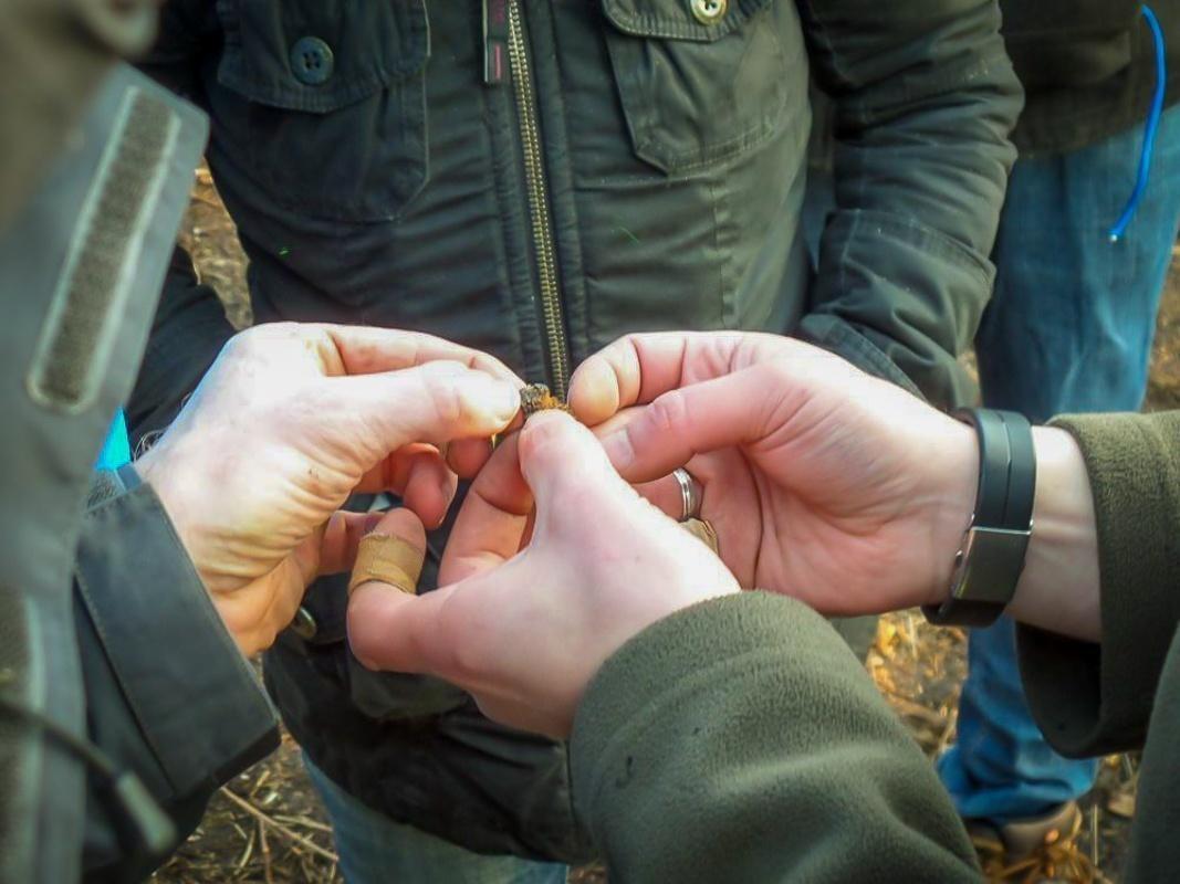 Zwei Personen arbeiten im Wald mit einem Messer und einem kleinen Gegenstand