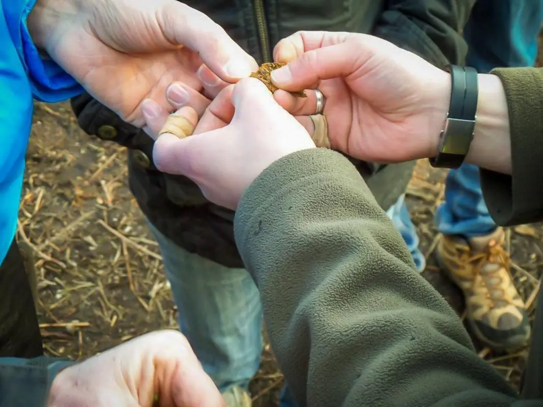 Gruppe betrachtet gemeinsam ein kleines Objekt in der Hand eines Teilnehmers