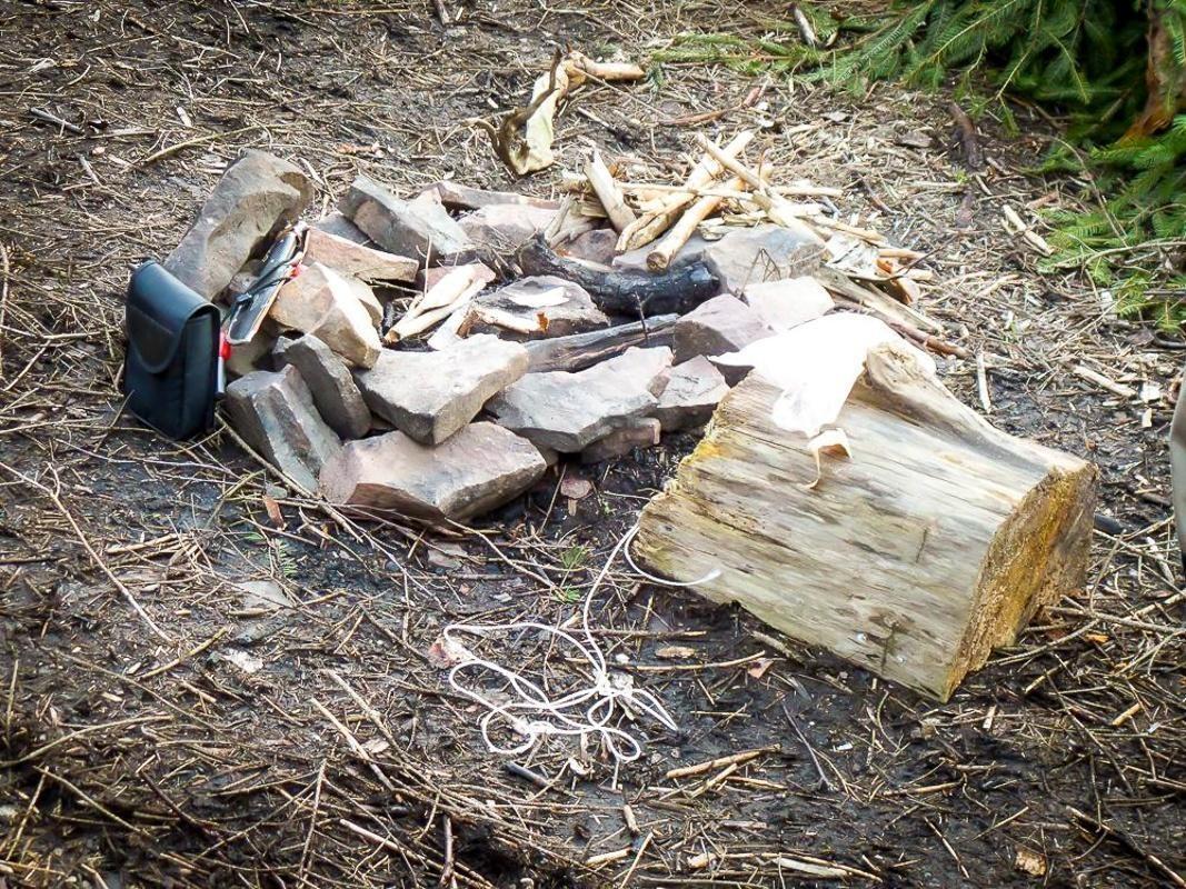 Kreis aus Steinen um ein kleines Bodenfeuer mit Holzstücken und Seil