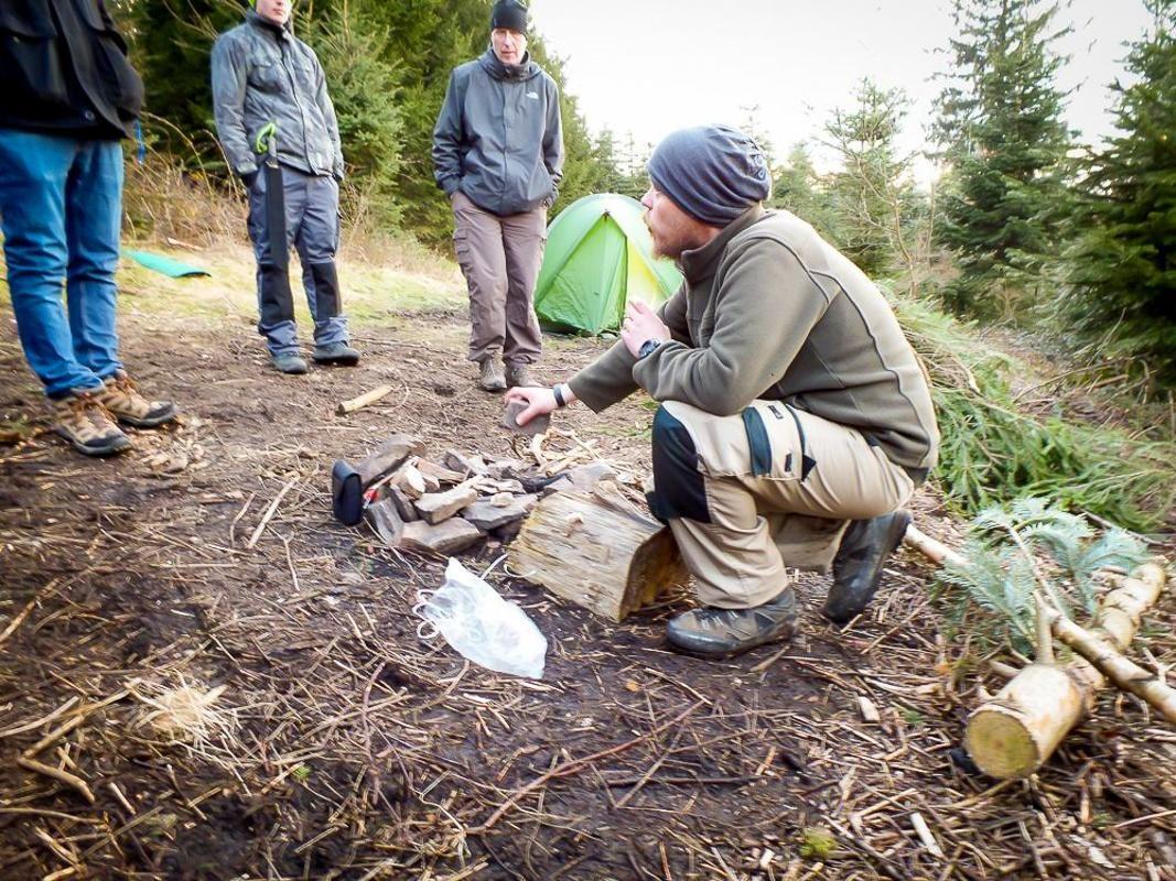 Mann erklärt Techniken am Lagerfeuer, Holz und Ausrüstung liegen auf dem Boden