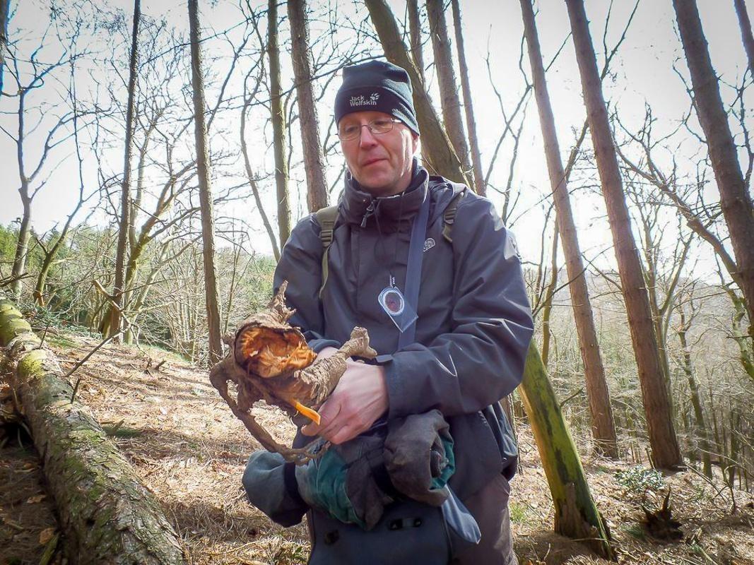 Mann hält ein Stück Holz mit innerer Fäulnis in einem Wald