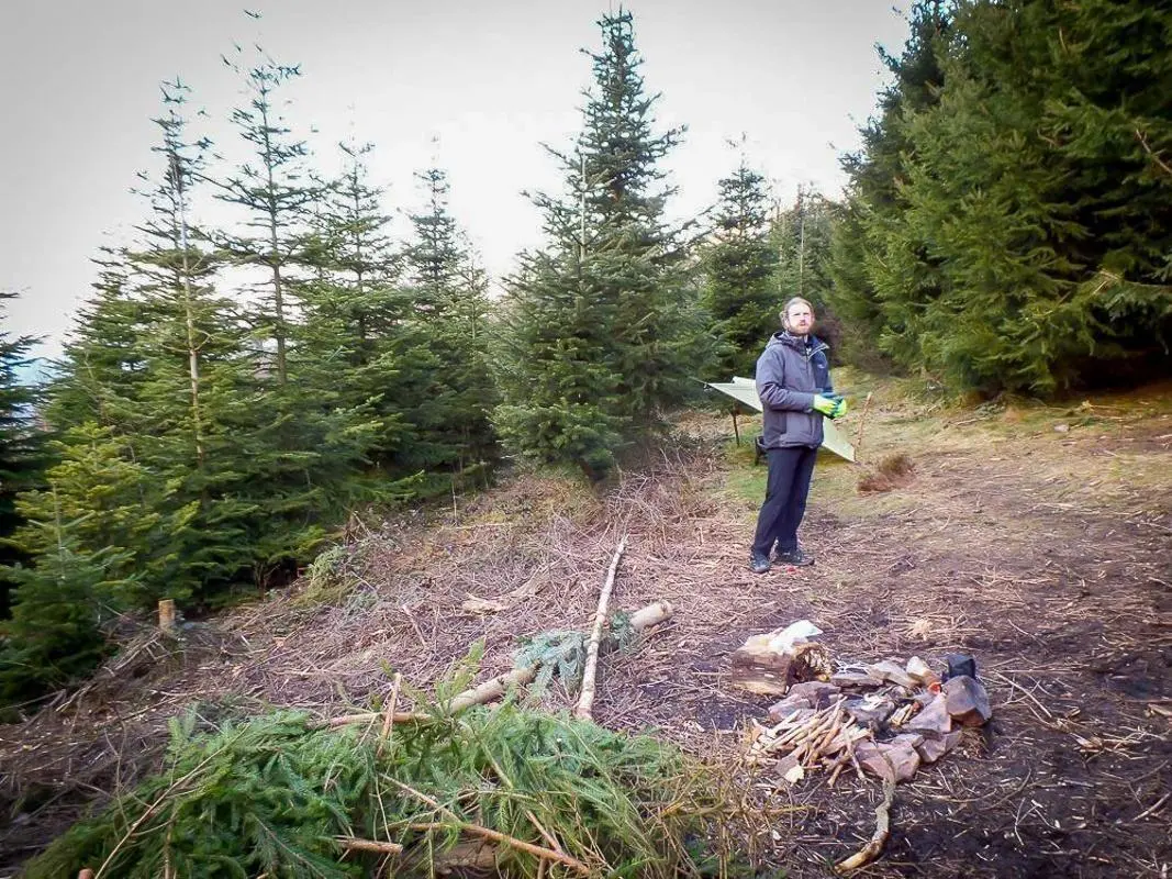 Gruppe steht um ein kleines Bodenfeuer im Wald, Tarp-Notunterkunft im Hintergrund