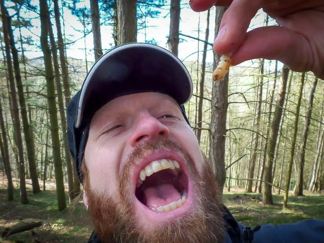 Mann hält einen Wurm in der Hand und öffnet den Mund weit