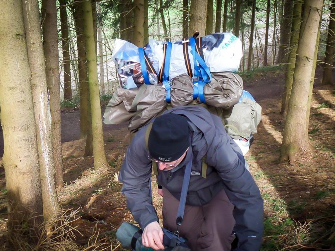 Mann mit Rucksack und improvisierter Trage in einem Waldgebiet