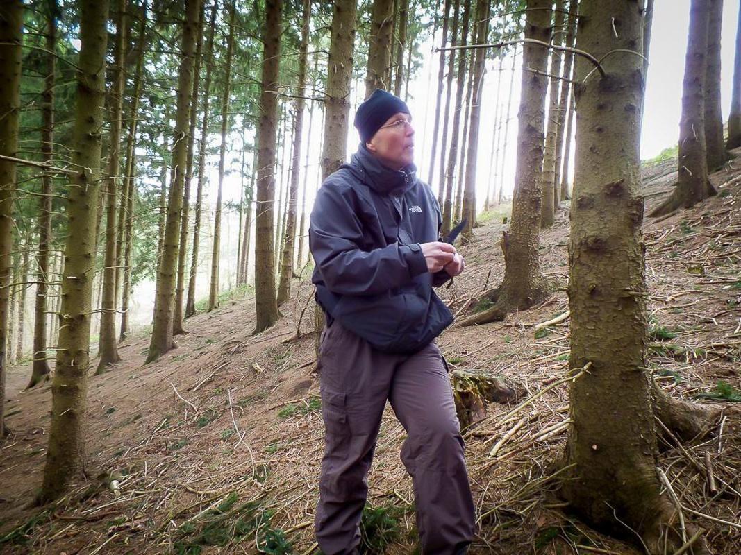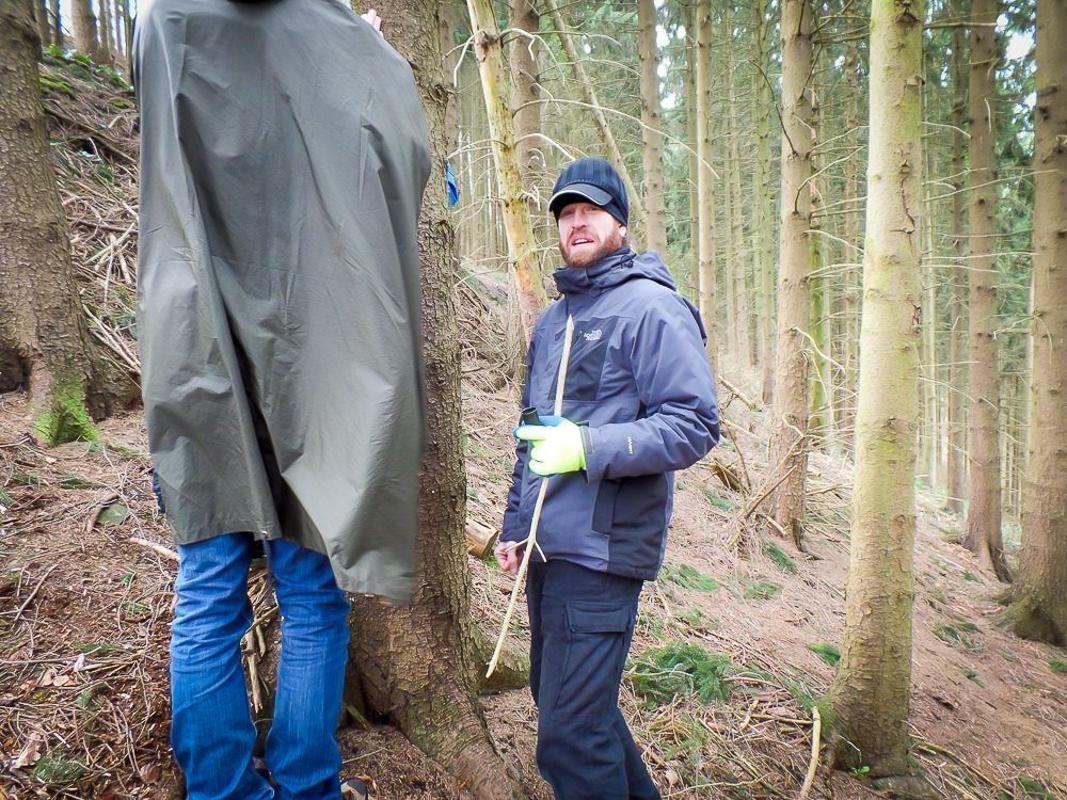 Zwei Personen stehen im Wald, einer hält einen Stock und schaut zur anderen