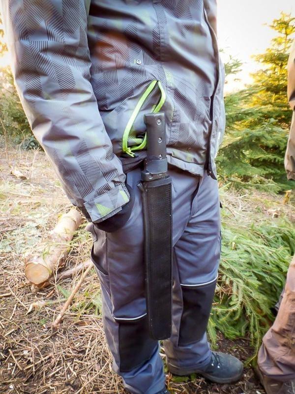 Messer schneidet in Baumrinde, während eine Person daneben steht
