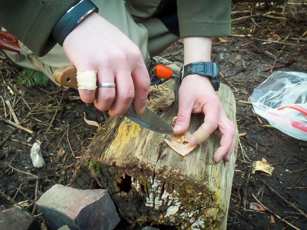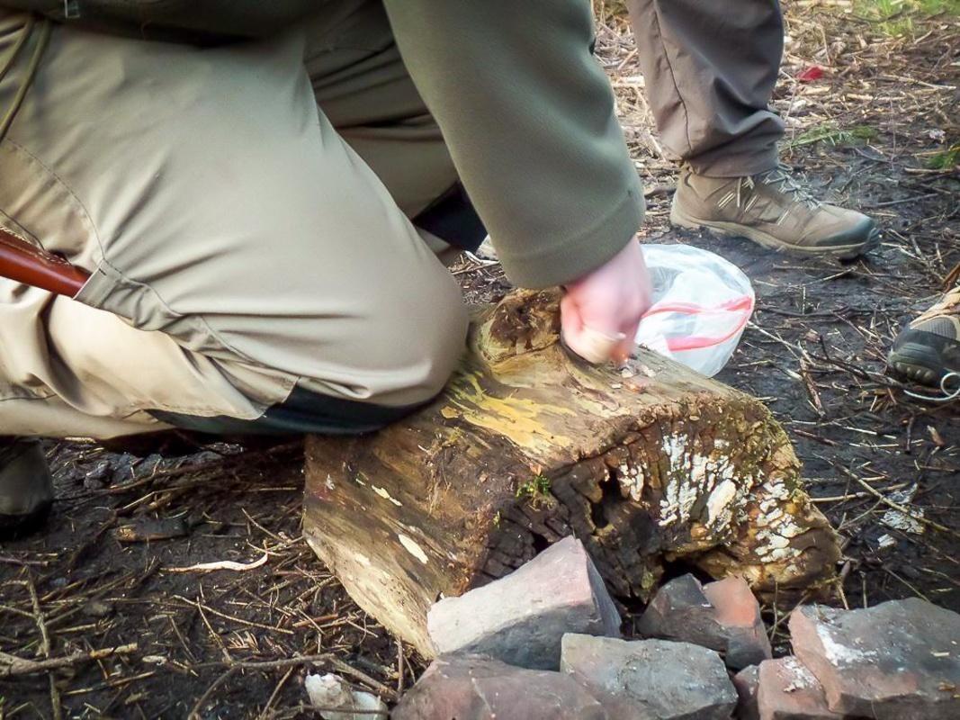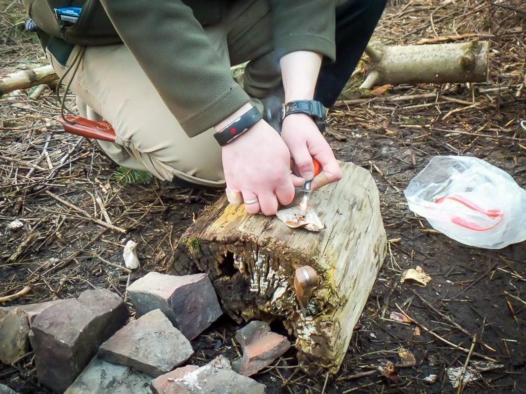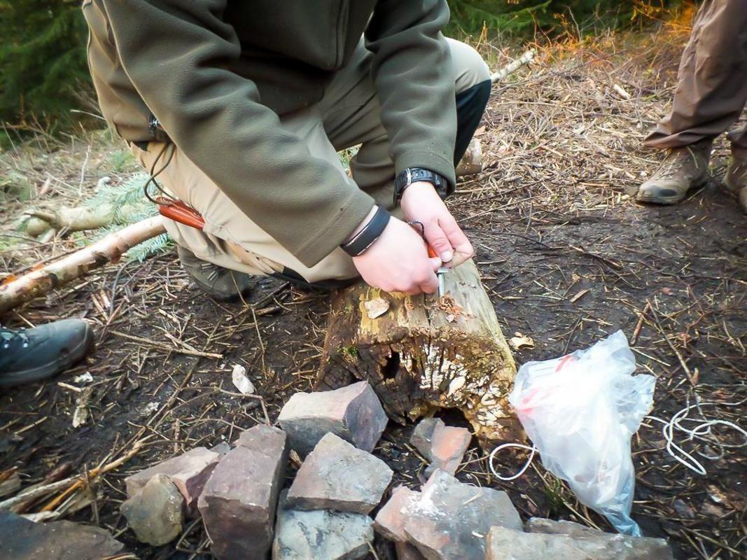 Messer schneidet Zunder auf einem Baumstamm, Steine liegen daneben