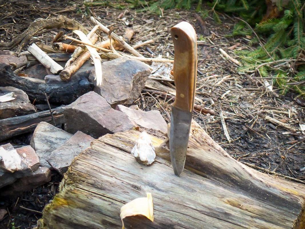 Messer steckt in einem Holzstück, umgeben von kleinen Ästen und Steinen