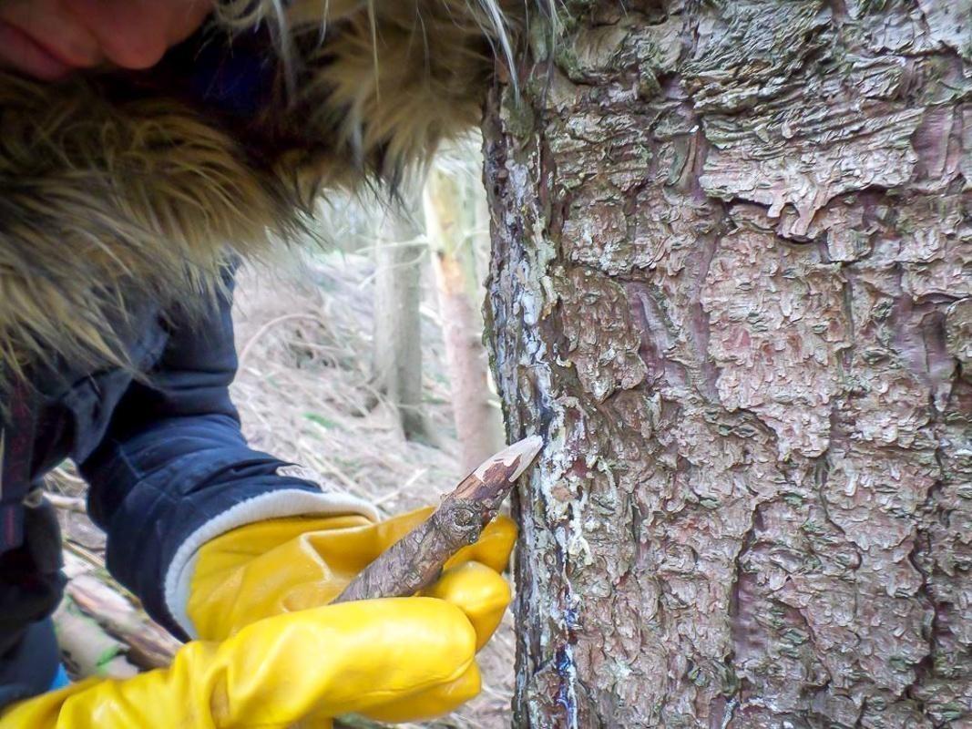 Stock kratzt an Baumrinde zur Gewinnung von Harz