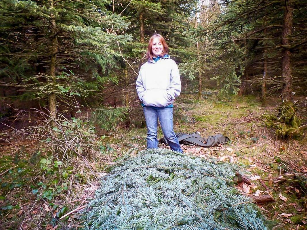Tarp-Notunterkunft aus Tannenzweigen im Wald, Person steht daneben