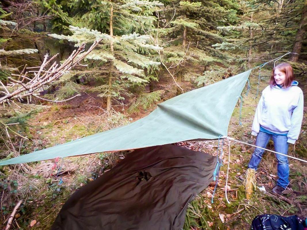 Tarp-Notunterkunft ist zwischen Bäumen gespannt, darunter liegt eine Decke