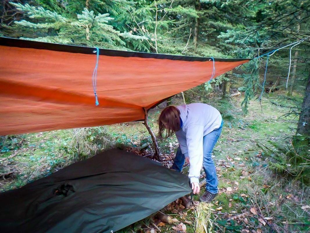 Gruppe arbeitet an einer Tarp-Notunterkunft zwischen Bäumen im Wald