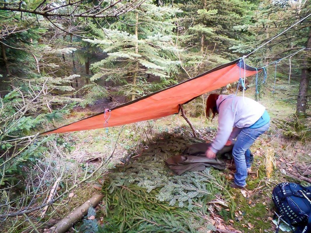 Tarp-Notunterkunft aus Tannenzweigen im Wald vorbereitet
