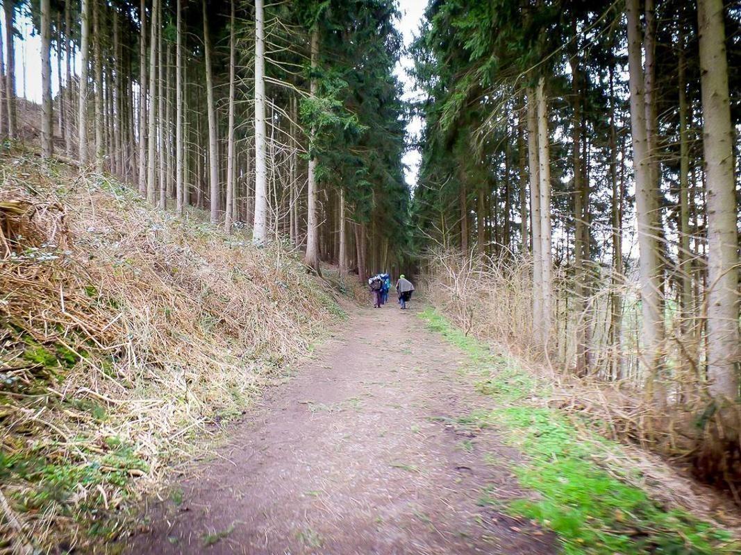 Wanderweg durch einen Wald mit mehreren Personen im Hintergrund