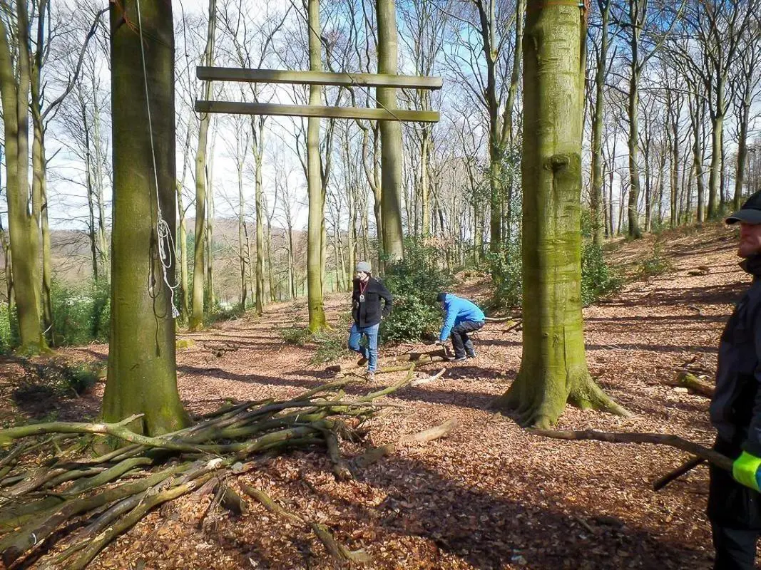 Drei Personen arbeiten an einer selbstgebauten Konstruktion aus Ästen im Wald