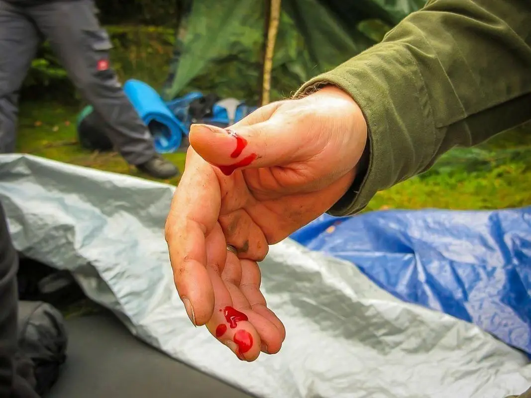 Blutige Hand mit roten Flecken, im Hintergrund Zelt und Ausrüstung sichtbar