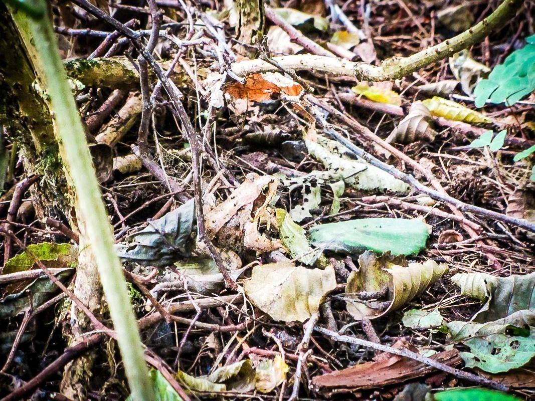 Holzstück mit Laub und Moos im Wald, umgeben von Laub und Ästen