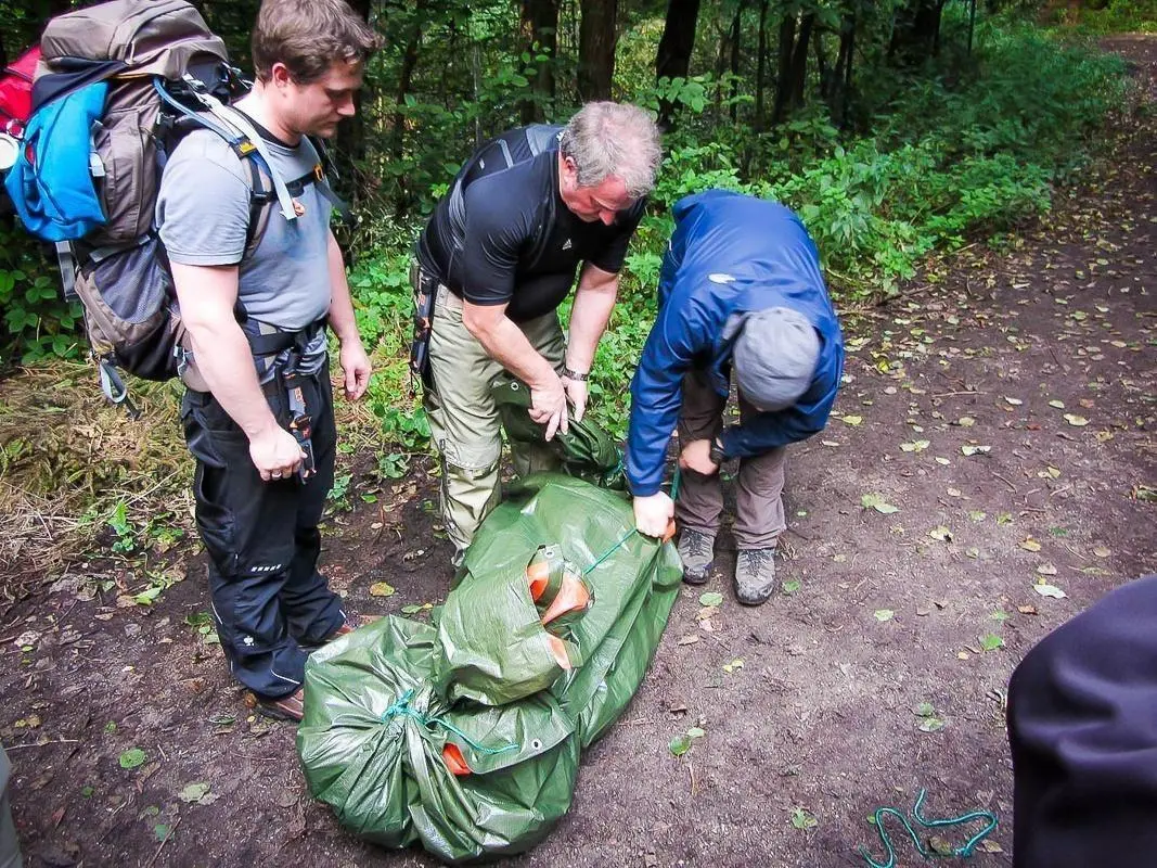 Drei Personen sichern eine grüne Tragetasche mit einem Seil im Wald