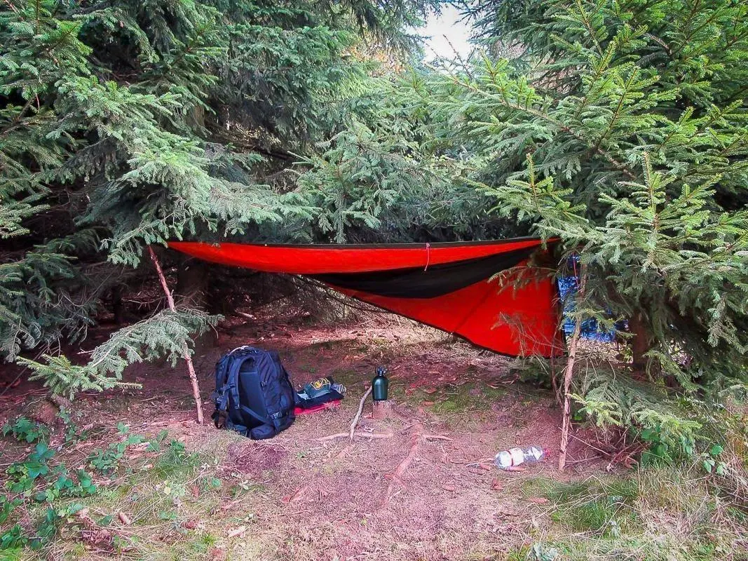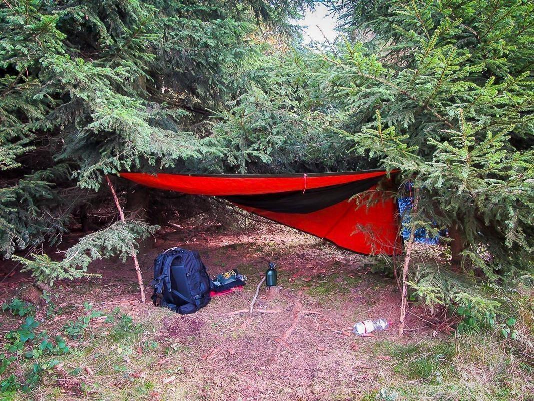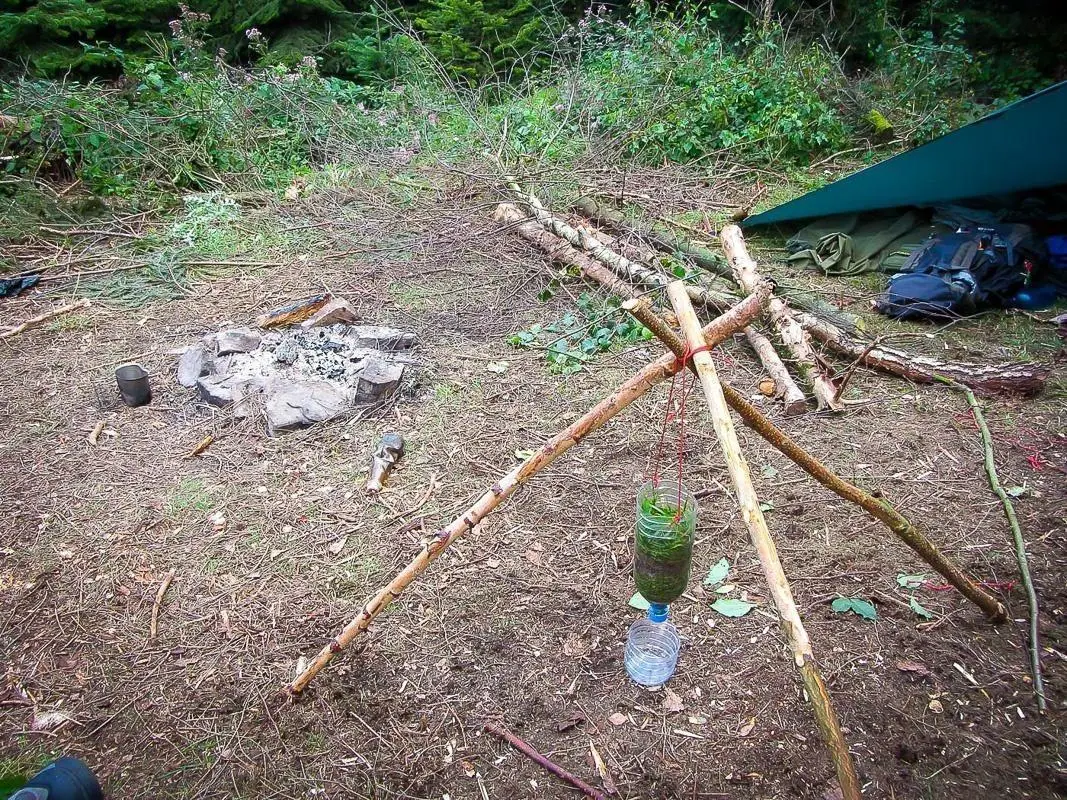 Tarp-Notunterkunft zwischen Bäumen mit Rucksack und Wasserflasche im Vordergrund