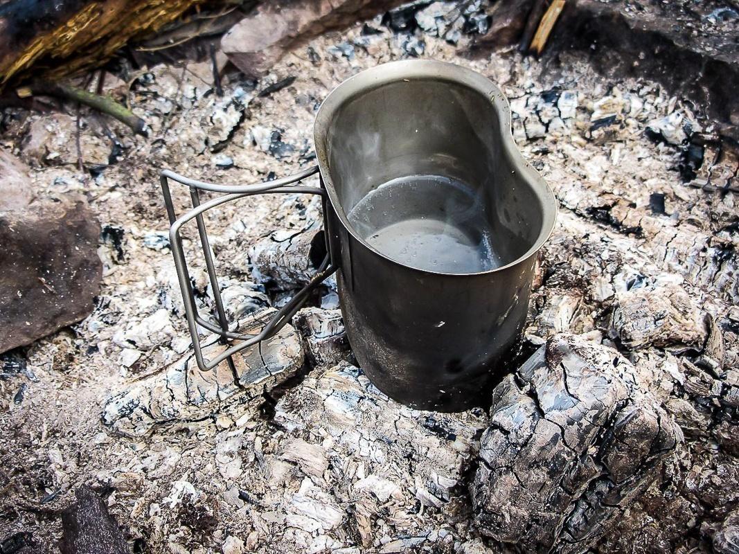 Edelstahlkessel steht auf grauen Asche-Resten eines Feuers