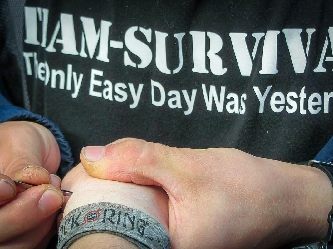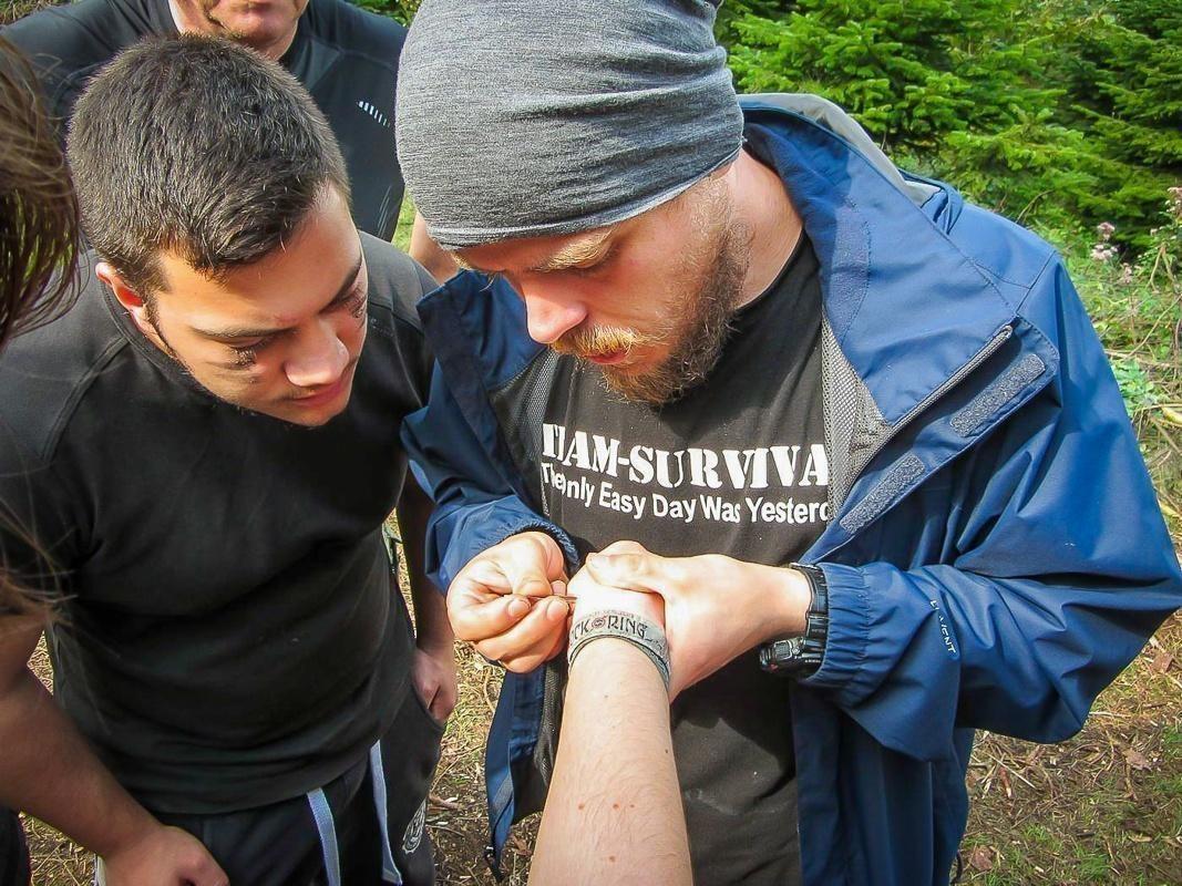 Ein Teilnehmer überprüft eine Bandage am Arm eines anderen