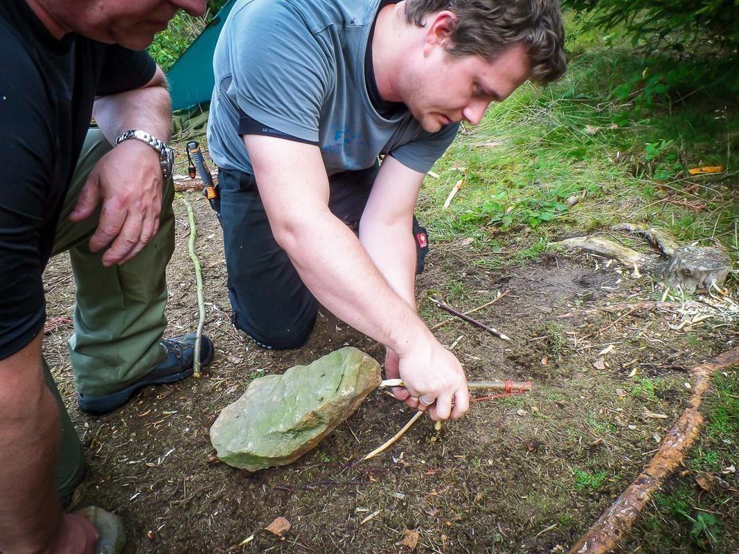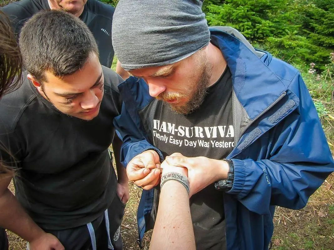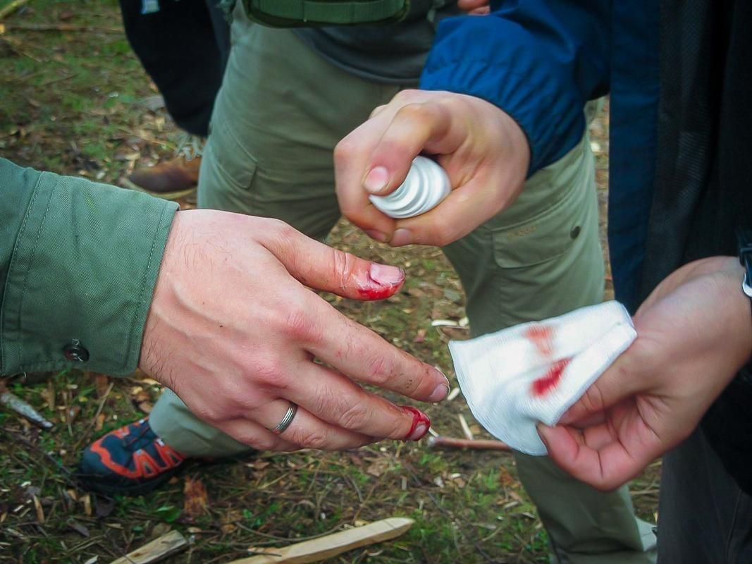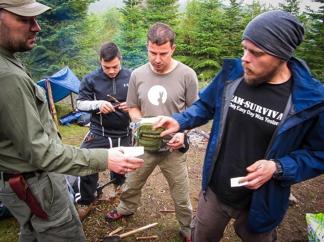 Ein weiterer wichtiger Bestandteil des Trainings war die Erste Hilfe. Die Teilnehmer übten das Versorgen von Wunden und erlernten verschiedene Bergen- und Tragetechniken, um Verletzte sicher zu transportieren. Diese Kenntnisse sind essenziell für das Überleben in Notsituationen. Auch das Fallenbauen wurde thematisiert; die Teilnehmer konstruierten einfache Fallen, um sich im Ernstfall Nahrungsressourcen zu sichern. Das Verständnis für die Natur und ihre Ressourcen wurde durch praktische Übungen vertieft.
