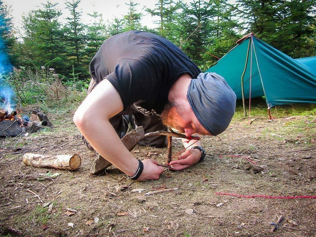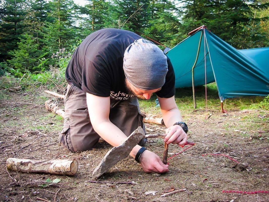 Mann schnitzt mit einem Messer an einem Stock neben einem kleinen Feuer