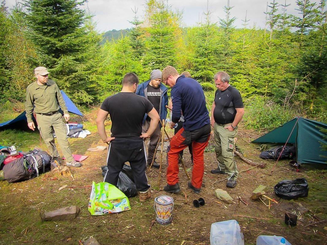 Gruppe arbeitet an einer Holzstruktur im Camp, Rucksäcke und Ausrüstung liegen verstreut