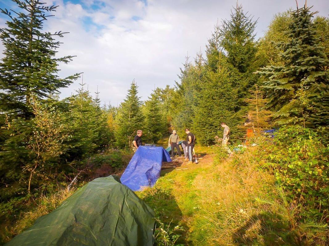Gruppierung arbeitet an der Aufstellung von Tarp-Notunterkünften im Wald