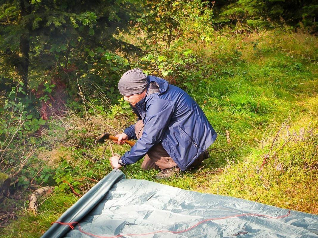 Hering wird in den Boden geschlagen, um eine Tarp-Notunterkunft zu sichern