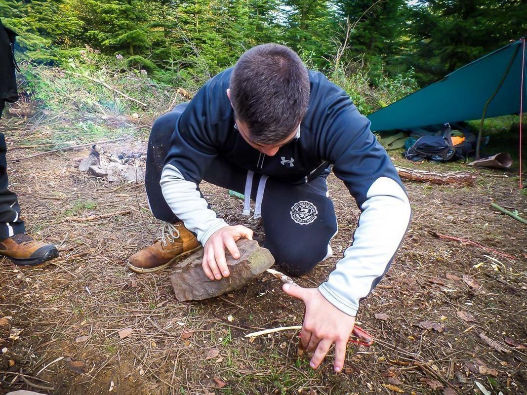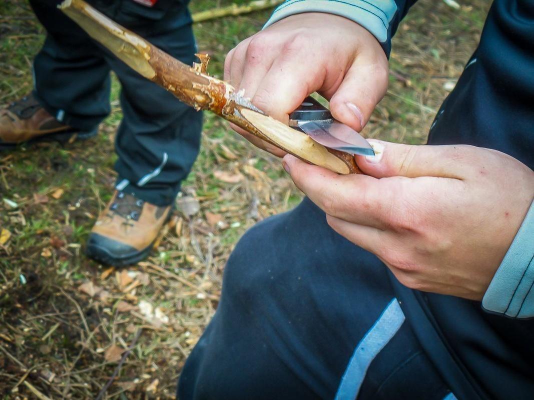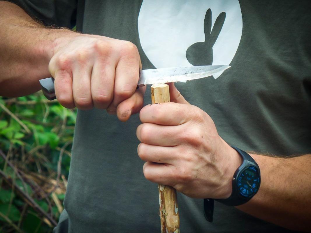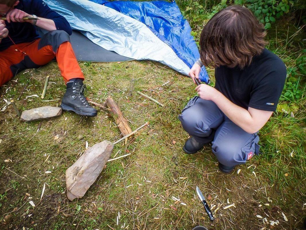 Holzstück wird mit einem Messer bearbeitet, während ein weiterer Stein daneben liegt