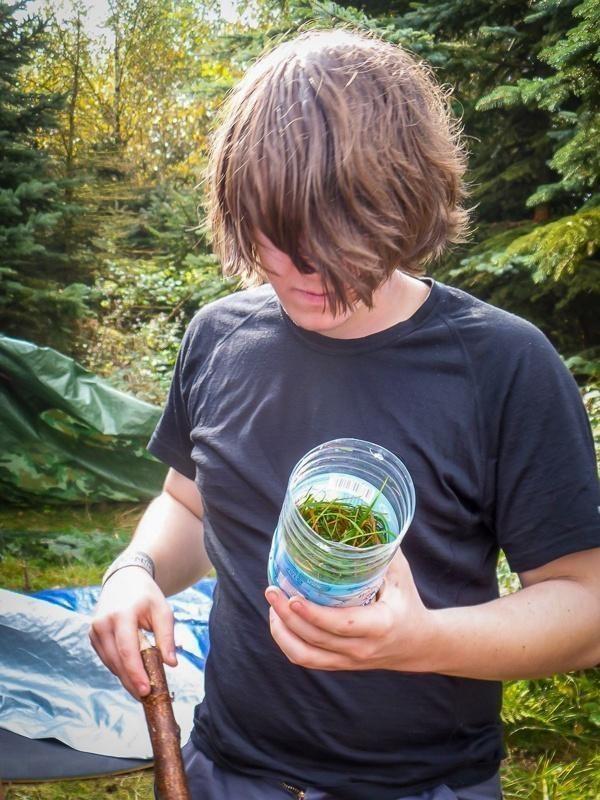 Junge hält ein Behältnis mit Zunder und einen Stock in der Hand
