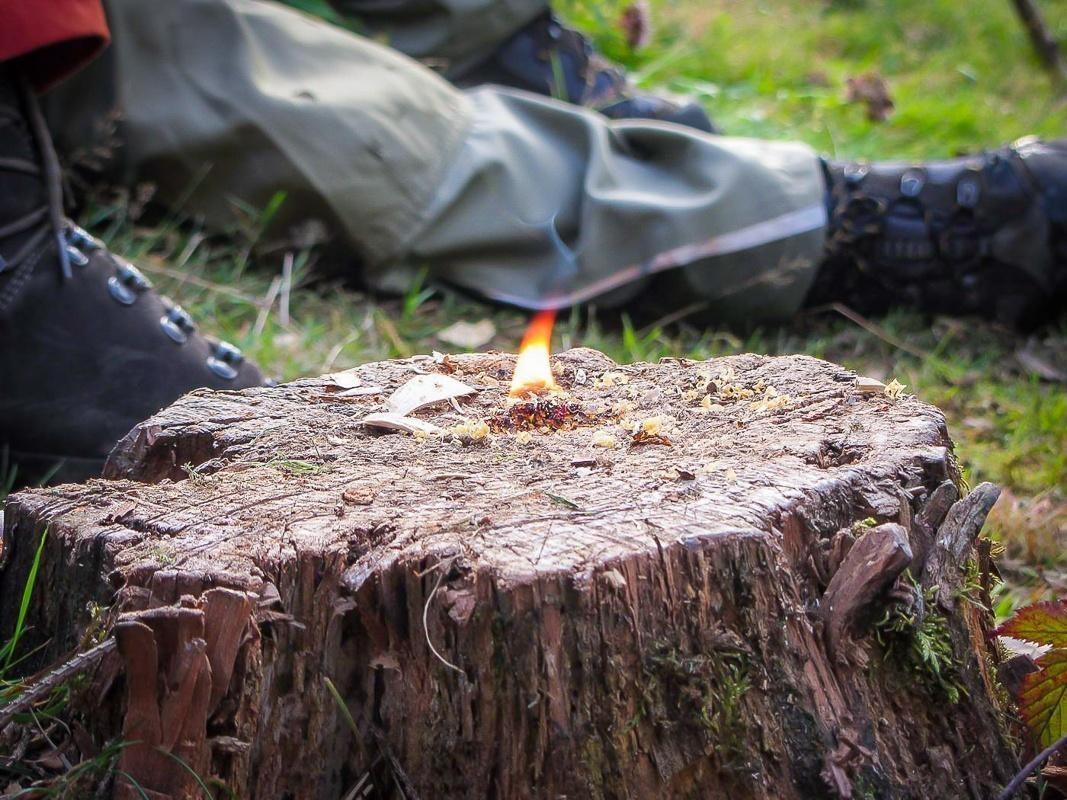 Kleine Flamme brennt zwischen Steinen, daneben liegt ein Stock mit Zunder