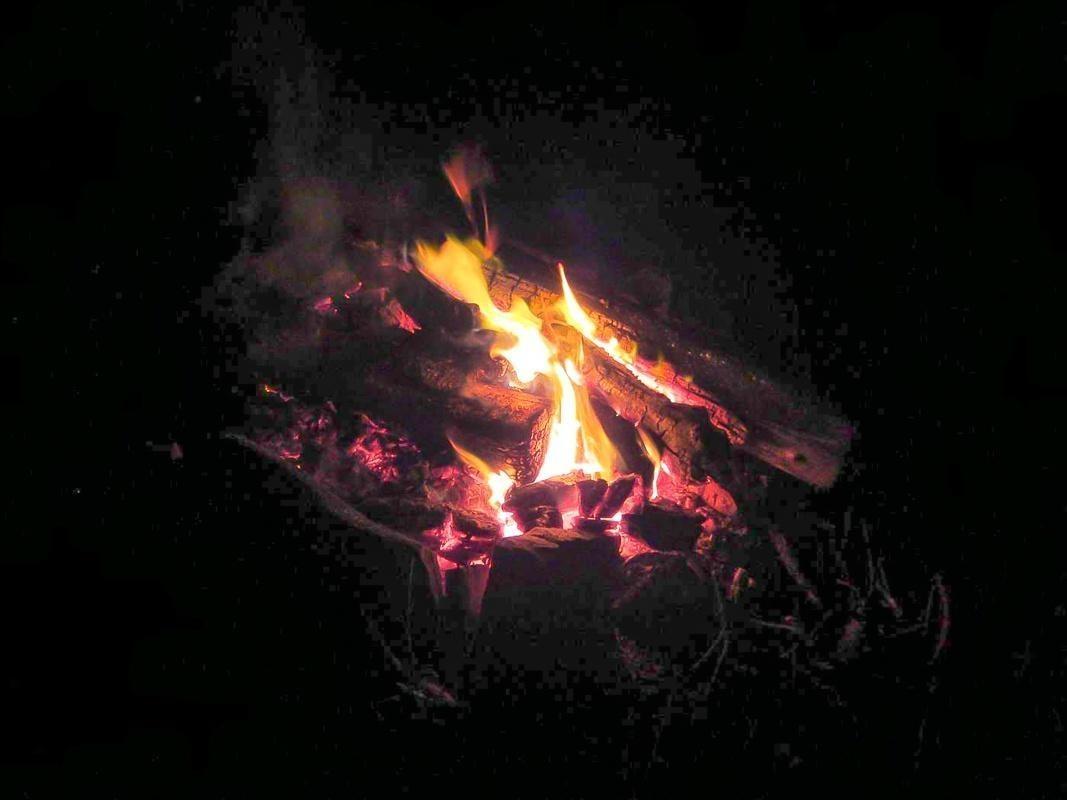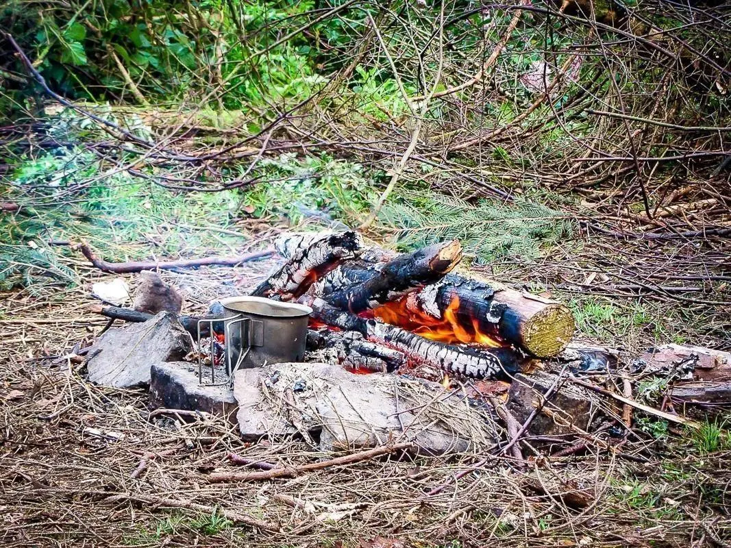 Kleine Flamme brennt zwischen Holzscheiten, Kessel steht auf Steinen