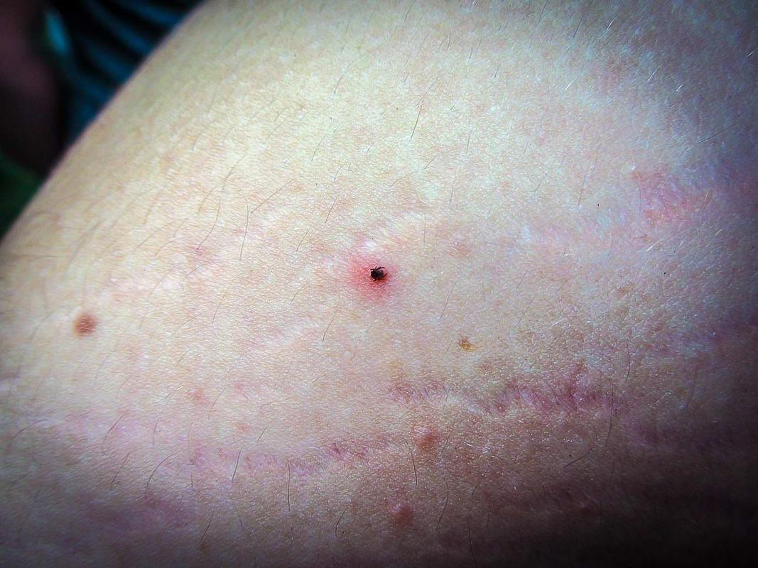 Kleiner schwarzer Punkt auf heller Haut, möglicherweise ein Zeckenbiss