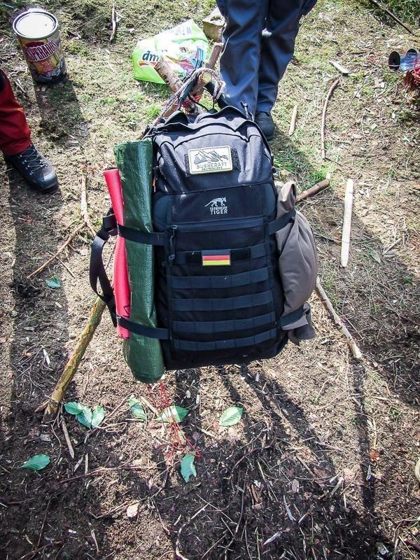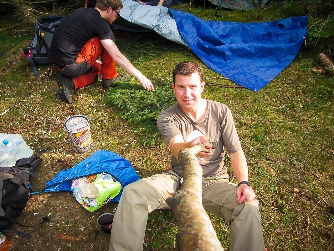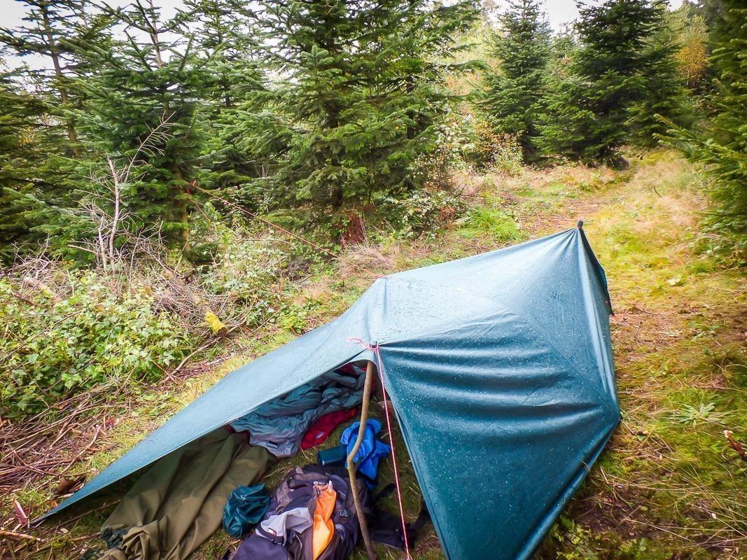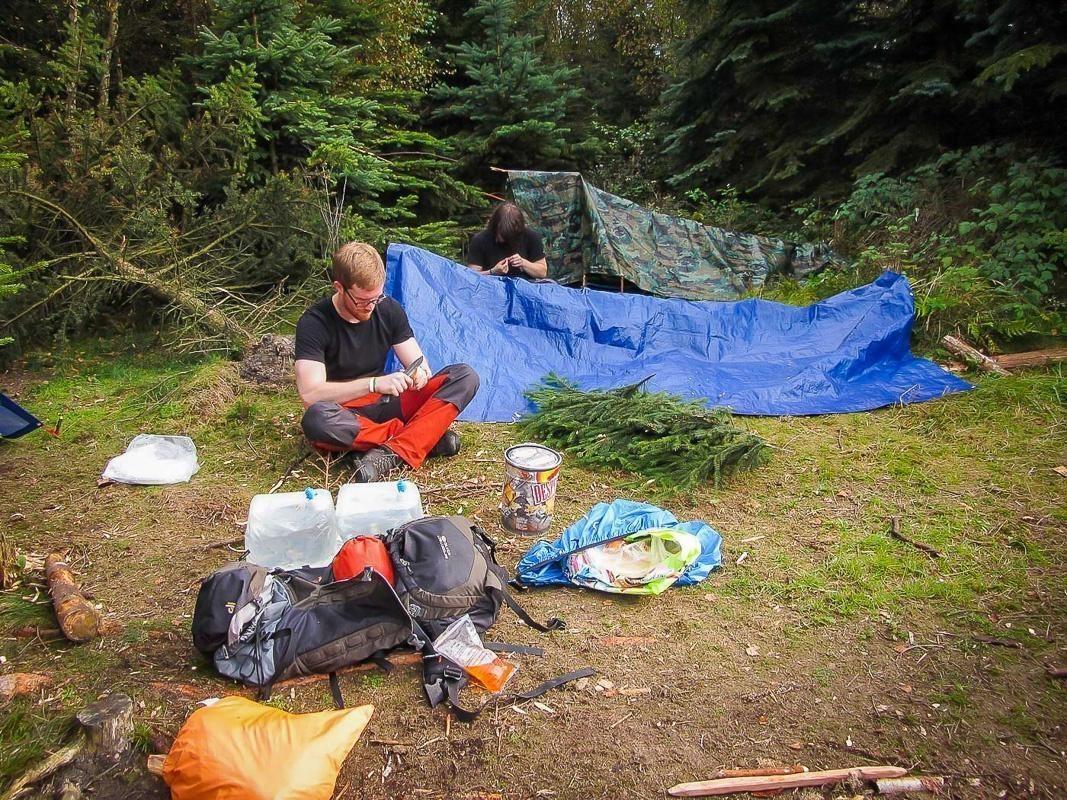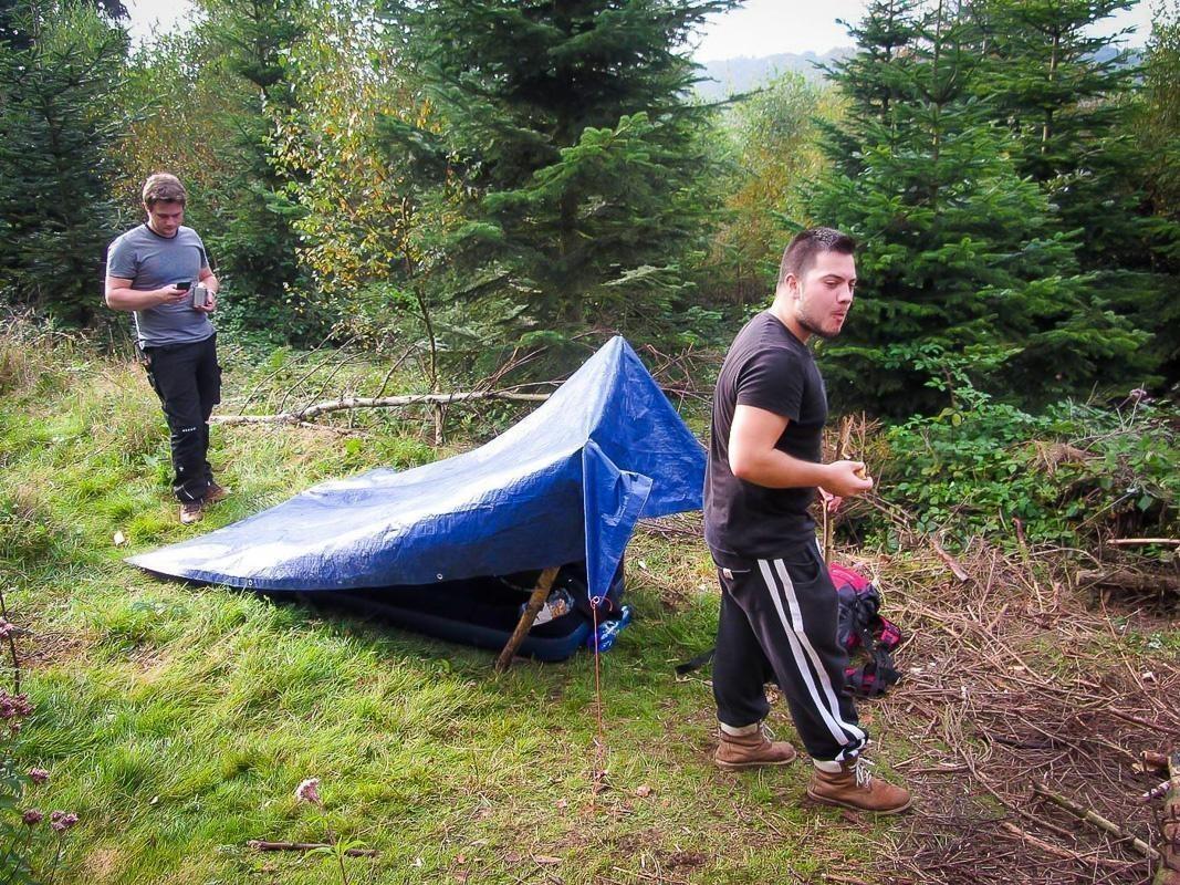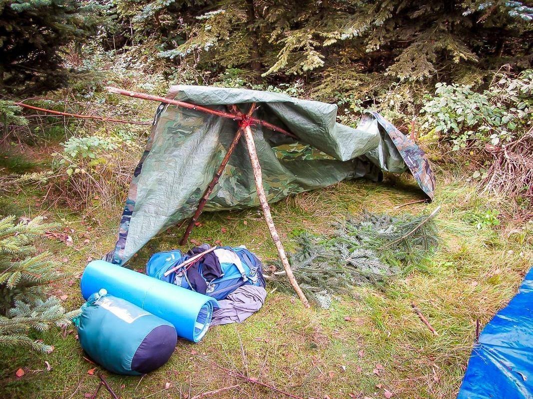 Tarp-Notunterkunft aus einer Plane und Ästen, daneben Rucksäcke und Isomatten