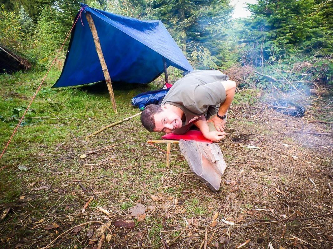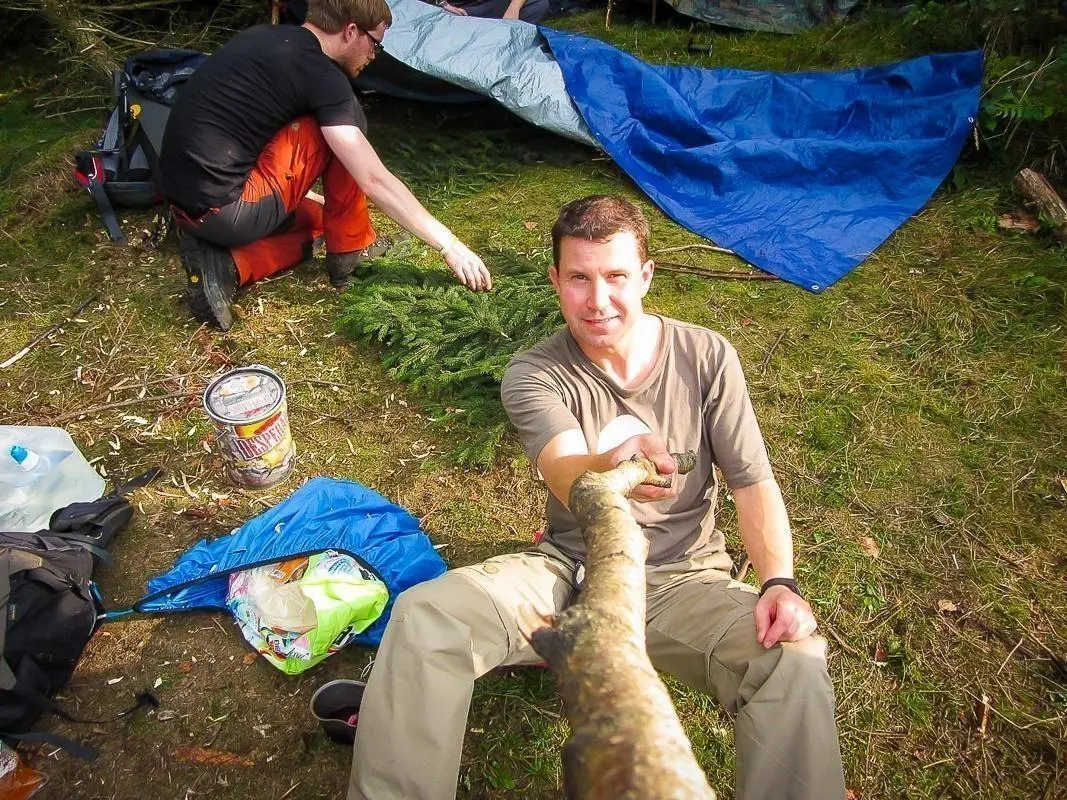 Mann trägt Holzstück zur selbstgebauten Tarp-Notunterkunft im Wald